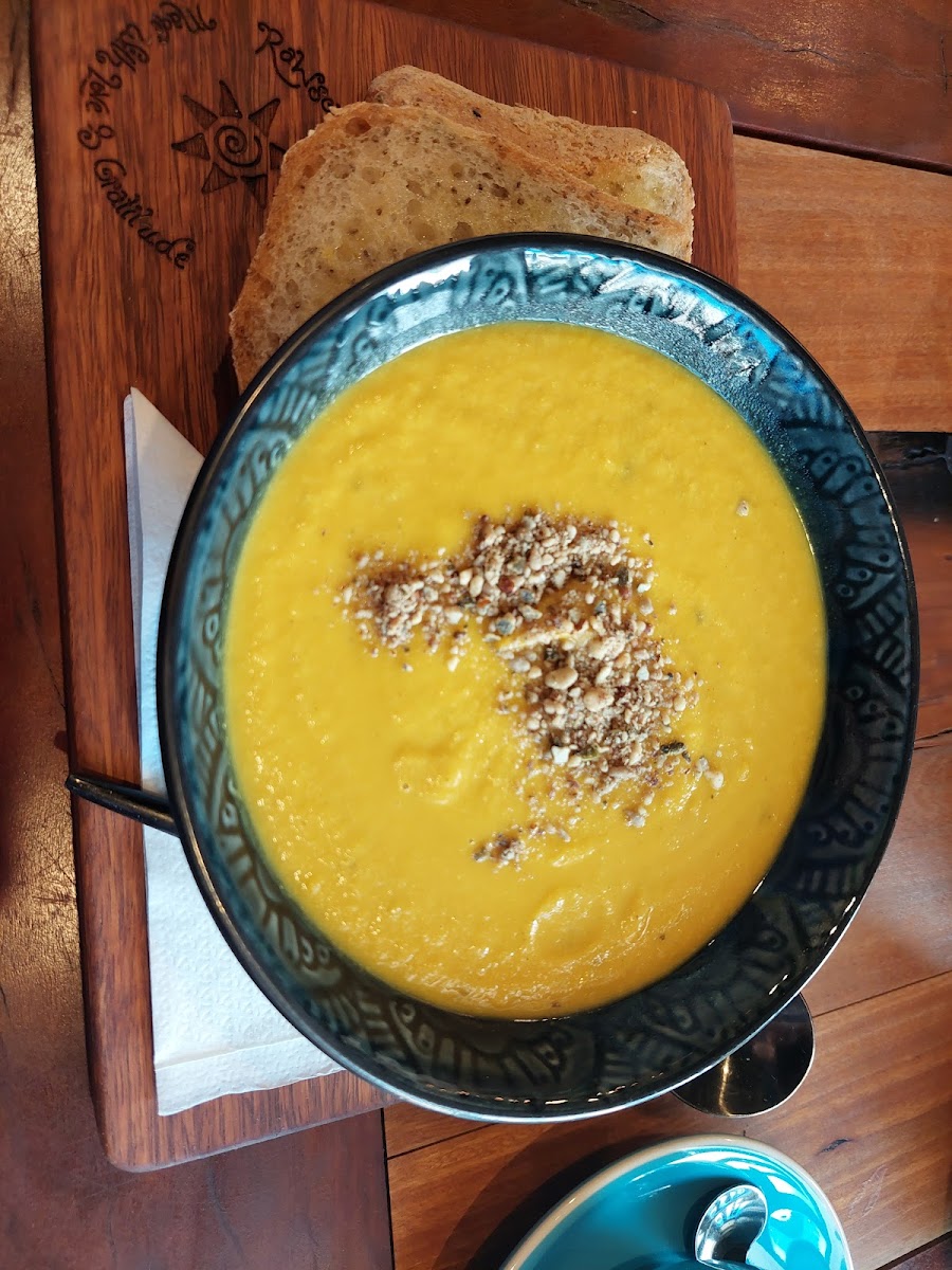 Very nice vegan / vegetarian cafe. Good options of vegan treats. We had pumpkin soup with gluten free sourdough, cashew cheese and avo toastie and vegan chocolate brownie, everything was delicious. I was impressed with the quality of the bread, I couldn't tell it was gluten free. Coffee was ok I will definitely come back to try more delicious options.